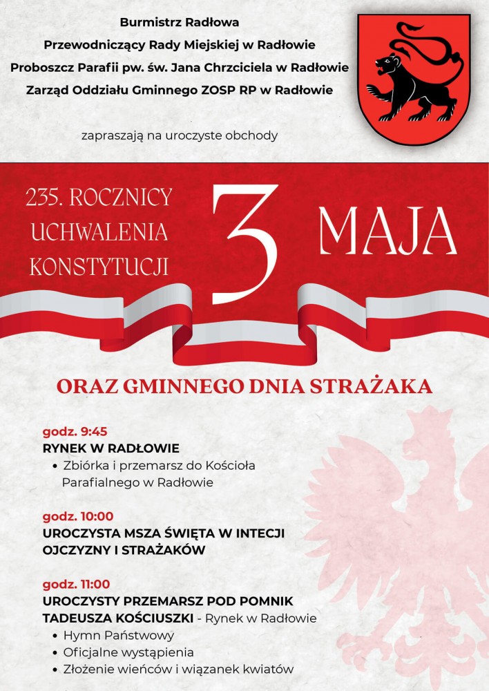 Burmistrz Radłowa, Przewodniczący Rady Miejskiej w Radłowie, Proboszcz Parafii pw. św. Jana Chrzciciela w Radłowie oraz Zarząd Oddziału Gminnego ZOSP RP w Radłowie zapraszają na uroczyste obchody 235. rocznicy uchwalenia Konstytucji 3 Maja oraz Gminnego Dnia Strażaka.