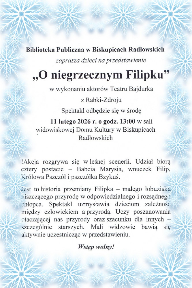 Spektatkl w wykonaniu aktorów Teatru Bajdurka obędzie się w 11 lutego 2026 r. (środa) o godz. 13:00 w sali widowiskowej Domu Kultury w Biskupicach Radłowskich.