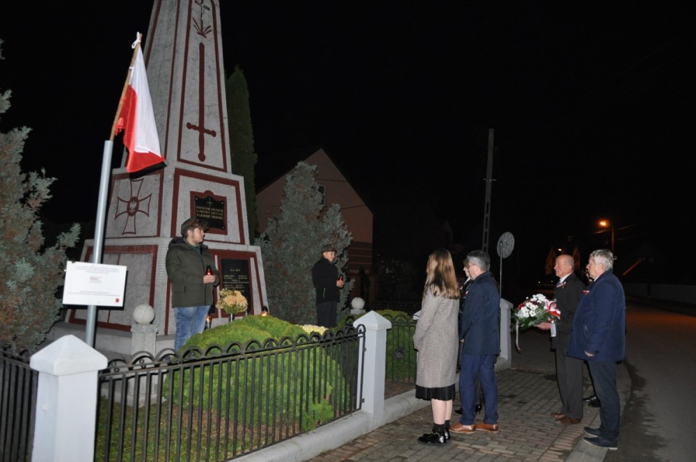 Po skończonej Eucharystii uformował się orszak, który przeszedł pod miejscowy Pomnik Poległych w obronie Ojczyzny w I i II wojnie światowej, gdzie delegacje złożyły kwiaty. Dalsza część obchodów rocznicowych miała miejsce w Niepublicznej Szkole Podstawowej w Przybysławicach. Jak zawsze licznie, w ten listopadowy wieczór, sala gimnastyczna wypełniła się mieszkańcami, którzy szczególnie upodobali sobie taką formę świętowania Niepodległości Polski. Zebranych powitała Pani Monika Wybraniec, dyrektor szkoły. W przemówieniu podkreśliła, jak ważna jest pamięć o naszych bohaterach narodowych i przeszłości Polski w kształceniu i rozwijaniu u dzieci i młodzieży uczuć i postaw patriotycznych.