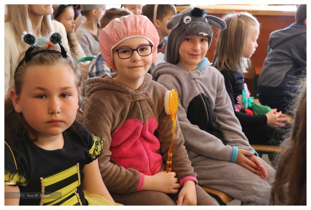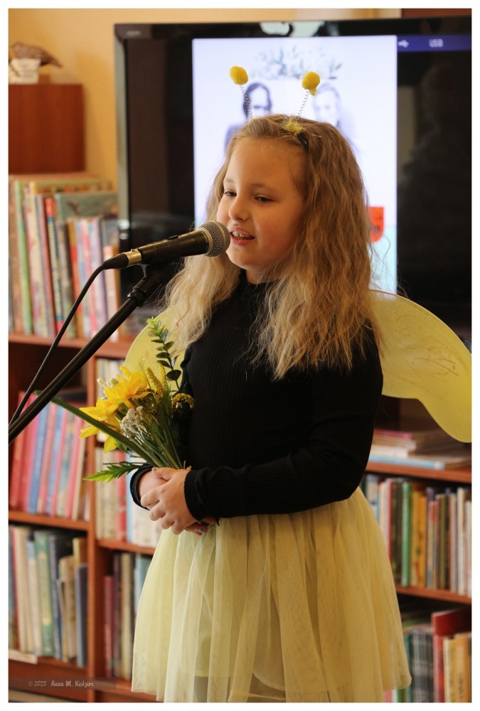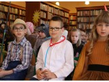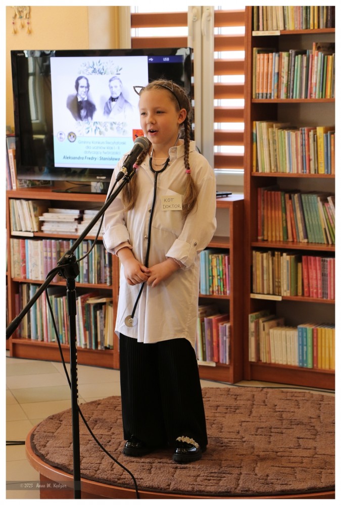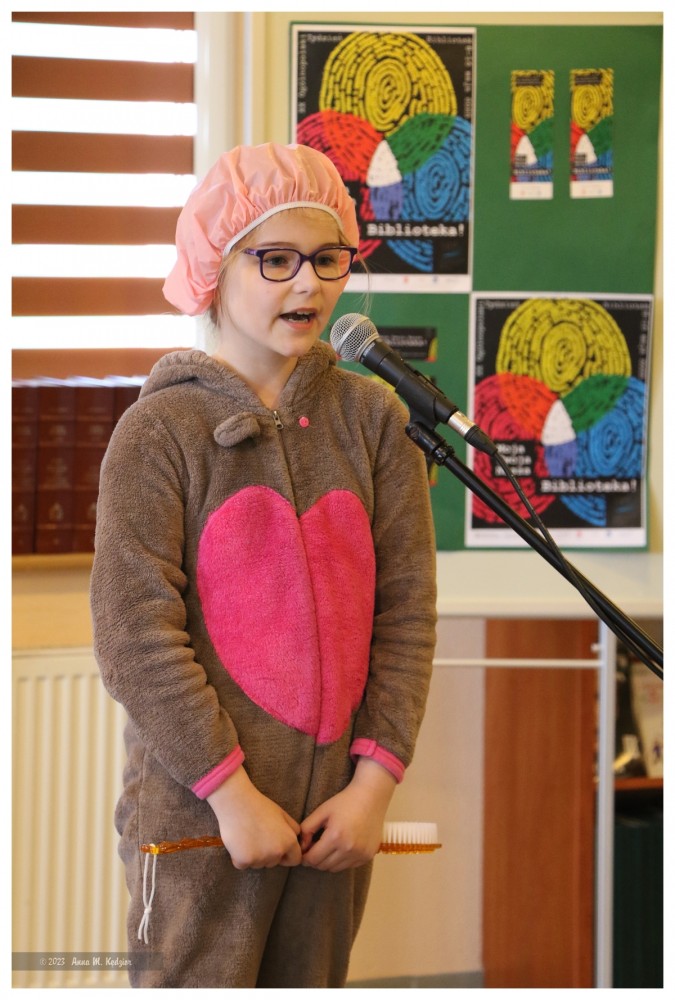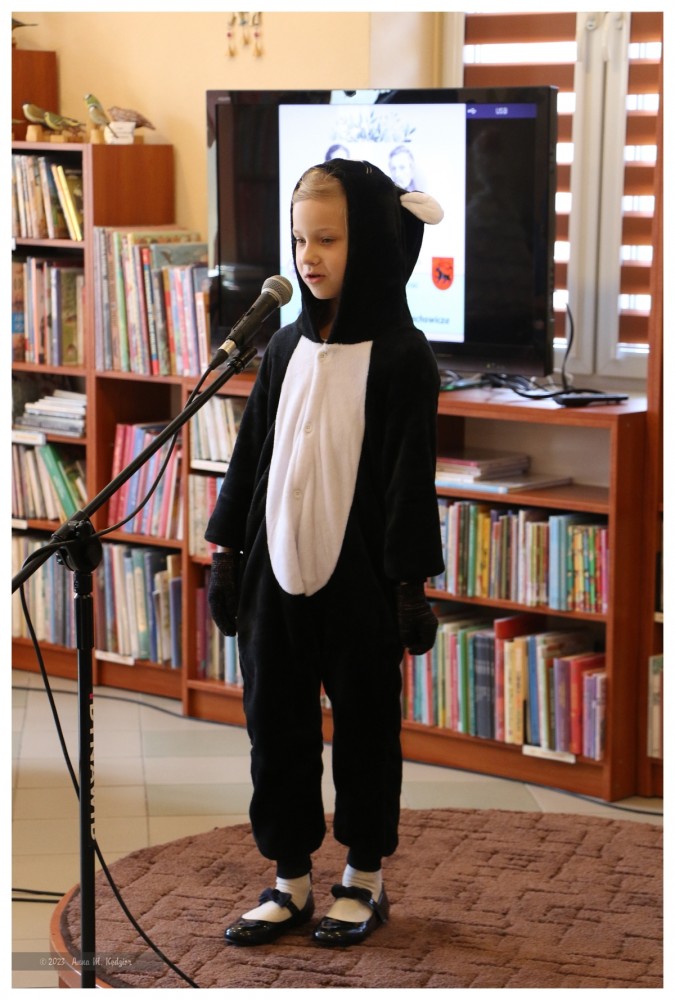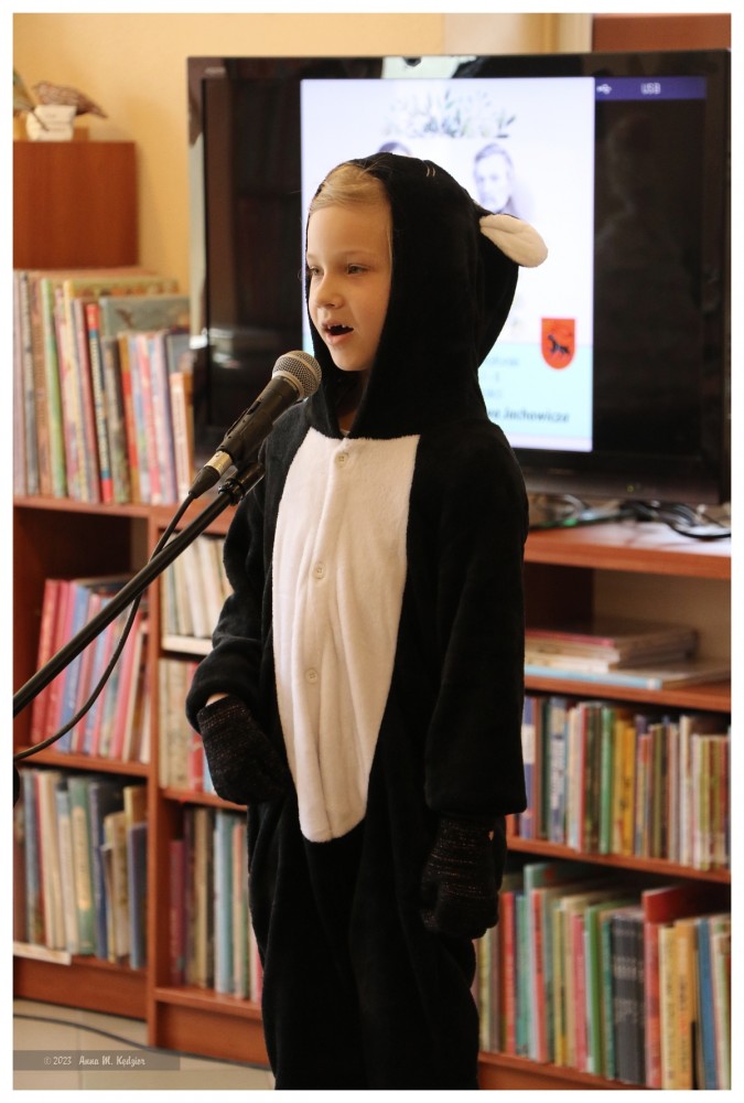 Barwne stroje, ciekawe rekwizyty i biblioteka wypełniona po brzegi bohaterami wierszy Aleksandra Fredry i Stanisława Jachowicza - tylu kotków, pszczółek, kogucików jeszcze nie gościliśmy w naszych progach. Do konkursu zgłosiło się 41 uczestników ze wszystkich szkół podstawowych z terenu gminy. Komisja konkursowa w składzie: pan Józef Trytek - przewodniczący, pani Karolina Masło oraz pani Aneta Baradziej podjęła się nie lada wyzwania, ponieważ poziom recytacji był wyjątkowo wysoki i wyrównany.