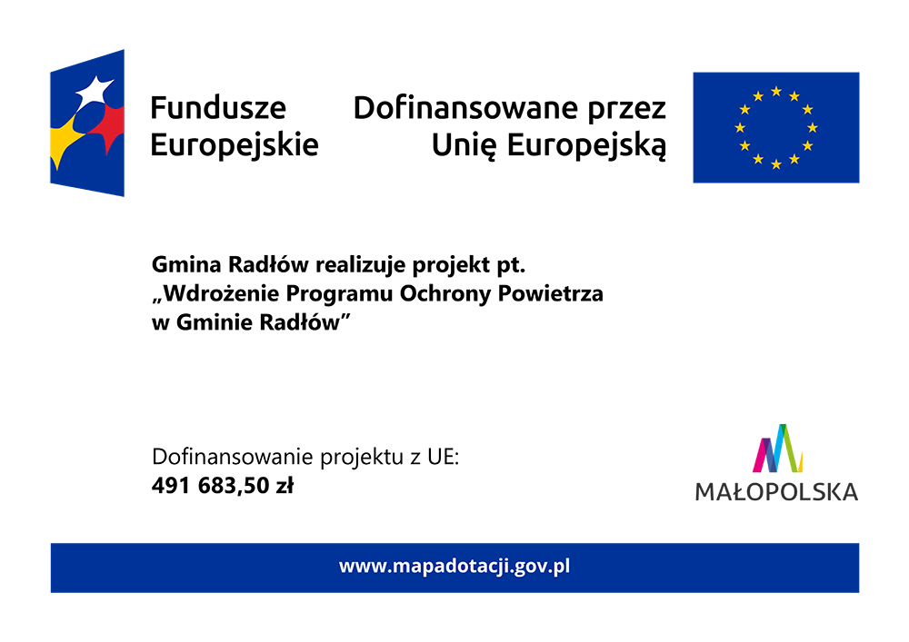 30 kwietnia 2024 r. została zawarta umowa pomiędzy Gminą Radłów a Zarządem Województwa Małopolskiego o dofinansowanie projektu pn. „Wdrożenie Programu Ochrony Powietrza w Gminie Radłów”.