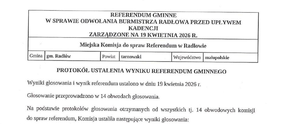 Miejska Komisja do spraw Referendum w Radłowie po zakończeniu swojej pracy opublikowała protokół ustalenia wyniku referendum gminnego (jest on dostępny w Biuletynie Informacji Publicznej Urzędu Miejskiego w Radłowie).