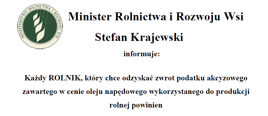 • w terminie od 3 sierpnia 2026 r. do 31 sierpnia 2026 r. należy złożyć odpowiedni wniosek do wójta, burmistrza lub prezydenta miasta, w zależności od miejsca położenia gruntów rolnych wraz z fakturami VAT (lub ich kopiami) stanowiącymi dowód zakupu oleju napędowego w okresie od 1 lutego 2026 r. do 31 lipca 2026 r. w ramach limitu zwrotu podatku określonego na 2026 r.